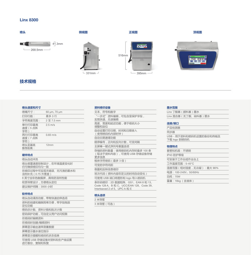 使用快捷,一鍵式更新資料 快干墨水在產(chǎn)品上實現(xiàn)清晰、準(zhǔn)確的噴碼 整體全金屬外殼,8英寸觸摸屏設(shè)計,簡單操作 多支持3行噴印,25點陣 配備噴頭自動清潔功能由您掌控 噴頭自帶加熱器,應(yīng)對極端環(huán)境 每分鐘噴碼多達(dá)420件產(chǎn)品,且清晰易讀