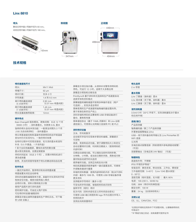 Linx 8810 操作簡單,可滿足多種噴碼需求,具備極高的運行 可靠性和用戶友好性。 快干墨水在產品上實現(xiàn)清晰、準確的噴碼 整體全金屬外殼,8英寸觸摸屏設計,簡單操作 多支持2行噴印,16點陣 配備噴頭自動清潔功能由您掌控 單行噴碼高速度:2.92m/s